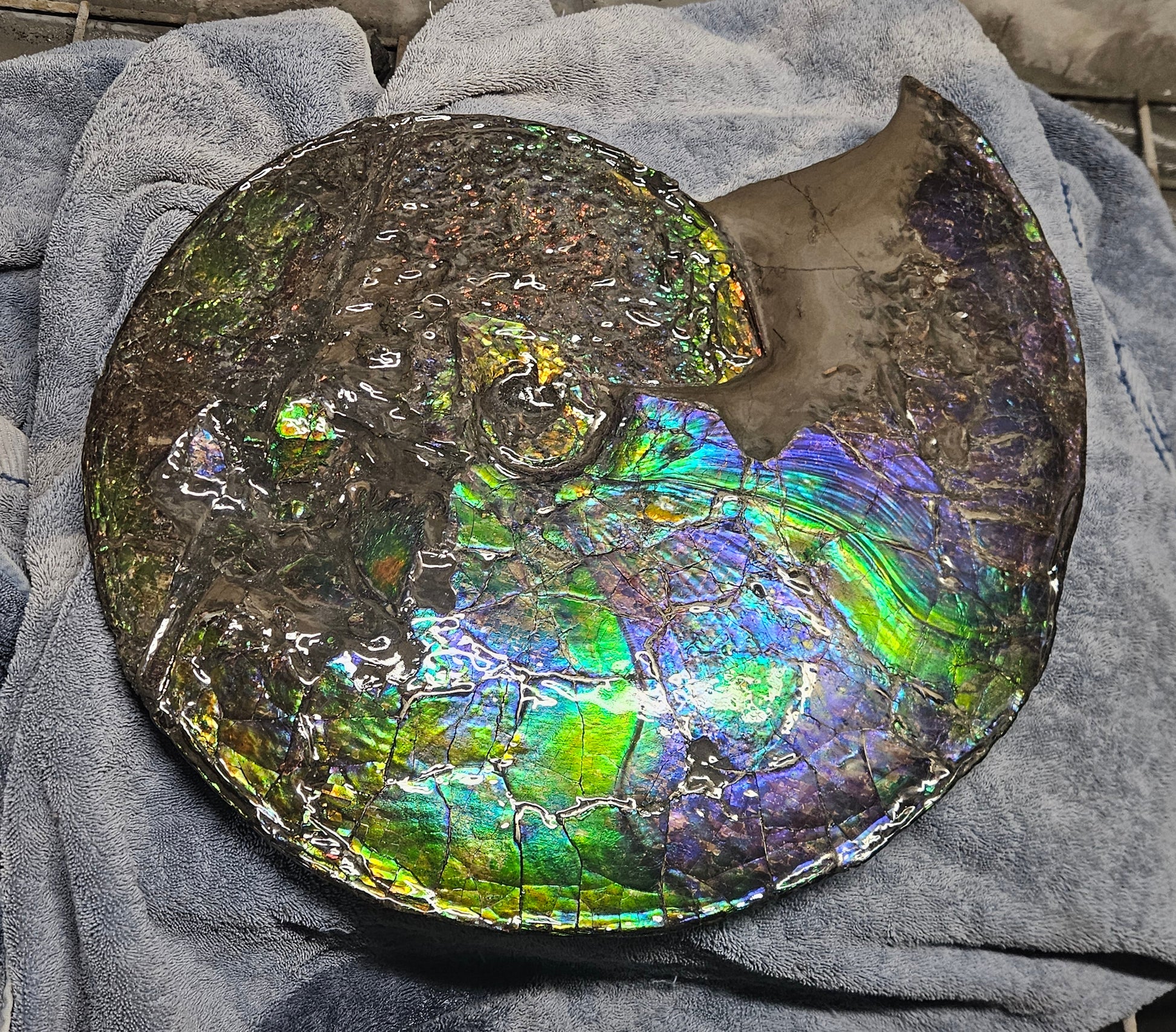 Our inaugural listing of the pinnacle of ammonite fossils: a Placenticeras meeki from the Bearpaw formation of Alberta! Having authored the keystone technical paper on this topic (see Mychaluk et al, 2001 in Gems & Gemology), I can confidently say this is a world-class specimen based on colouration, completeness, definition of details and minimal restoration and repair. Furthermore, this specimen measures at an impressive 16.5" diameter!