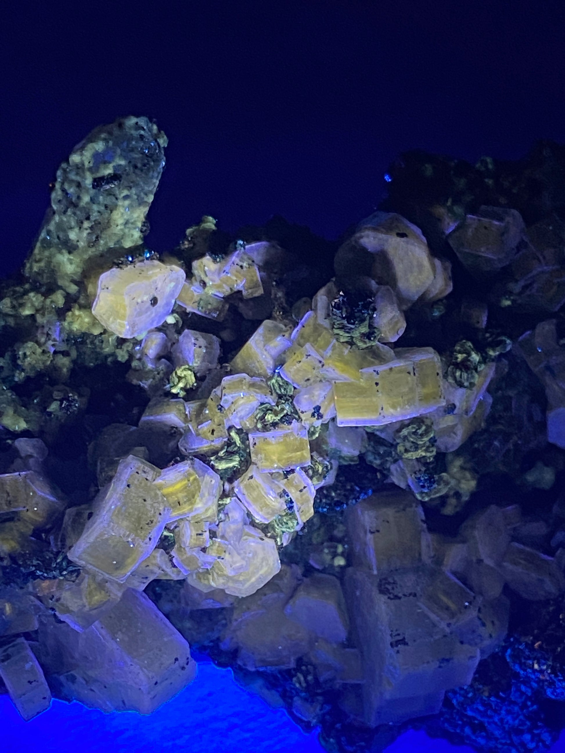 Multiple hexagonal, greenish apatite crystals liberally scattered on a matrix of pyrite with quartz. Strong yellow response, from the lustrous apatite crystals, when exposed to long wave (365nm) ultraviolet light. There is minor abrasion to a few of the apatite crystals, but is an attractive display specimen nonetheless. This has been in the collection of Sarah Topham for decades. Ex Prosper Williams, Ex Sarah Topham. Accompanied by a Prosper J. Williams label (circa pre-1980). From: Panasquiera, Portugal. Dimensions: 6 cm x 9 cm