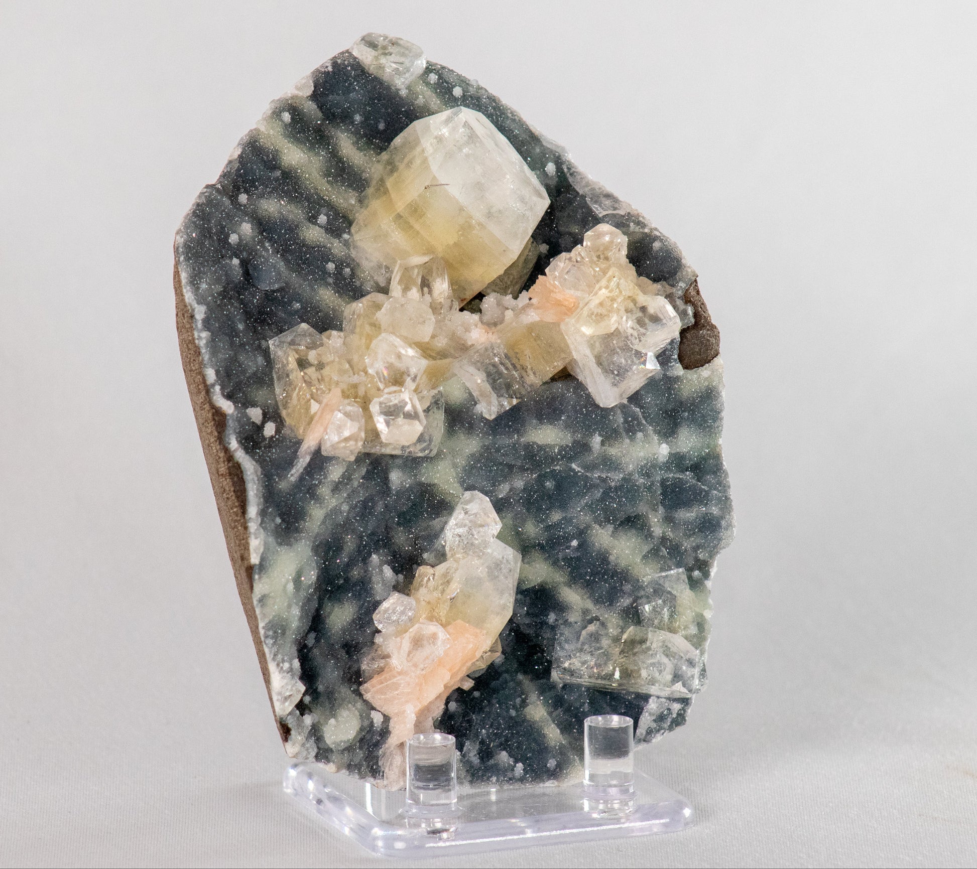 Two common zeolite minerals from India but of excellent quality and composition. The salmon-coloured stilbites are cute but I really like the gemmy apophyllite crystals, especially the little ones. The dark matrix is covered in a light druse of micro quartz crystals, giving both nice colour contrast to the larger minerals, and plenty of additional sparkle too! Ex George Sutherland collection. From: Nasin, Maharashtra, India. Dimensions: 3.5 cm x 8 cm x 11 cm