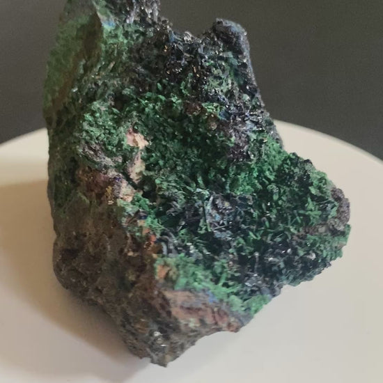 The late Garry Kolodinsky was a well-loved teacher in Victoria, British Columbia who amassed a sizeable and varied mineral collection over several decades. Garry, in particular, had a soft spot for azurite with a sub-collection of specimens from the world famous mines in Tsumeb, Namibia. This piece is typical of what Garry acquired: hand-sized specimens of massive digenite with sprays of azurite crystals with malachite. As in this case, malachite often replaces but retains the form earlier generations of azurite (called a pseudomorph). This is an excellent representation of a classic Tsumeb combination difficult to find in this size and price range. Dimensions: 5 cm x 5.5 cm x 8 cm