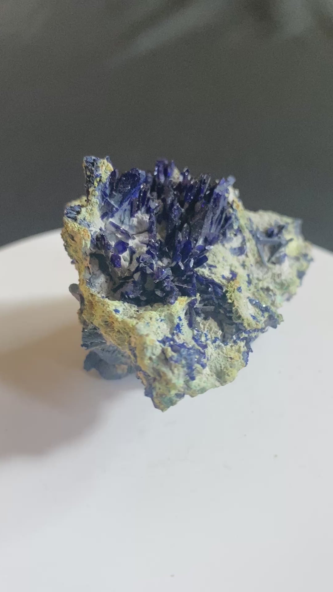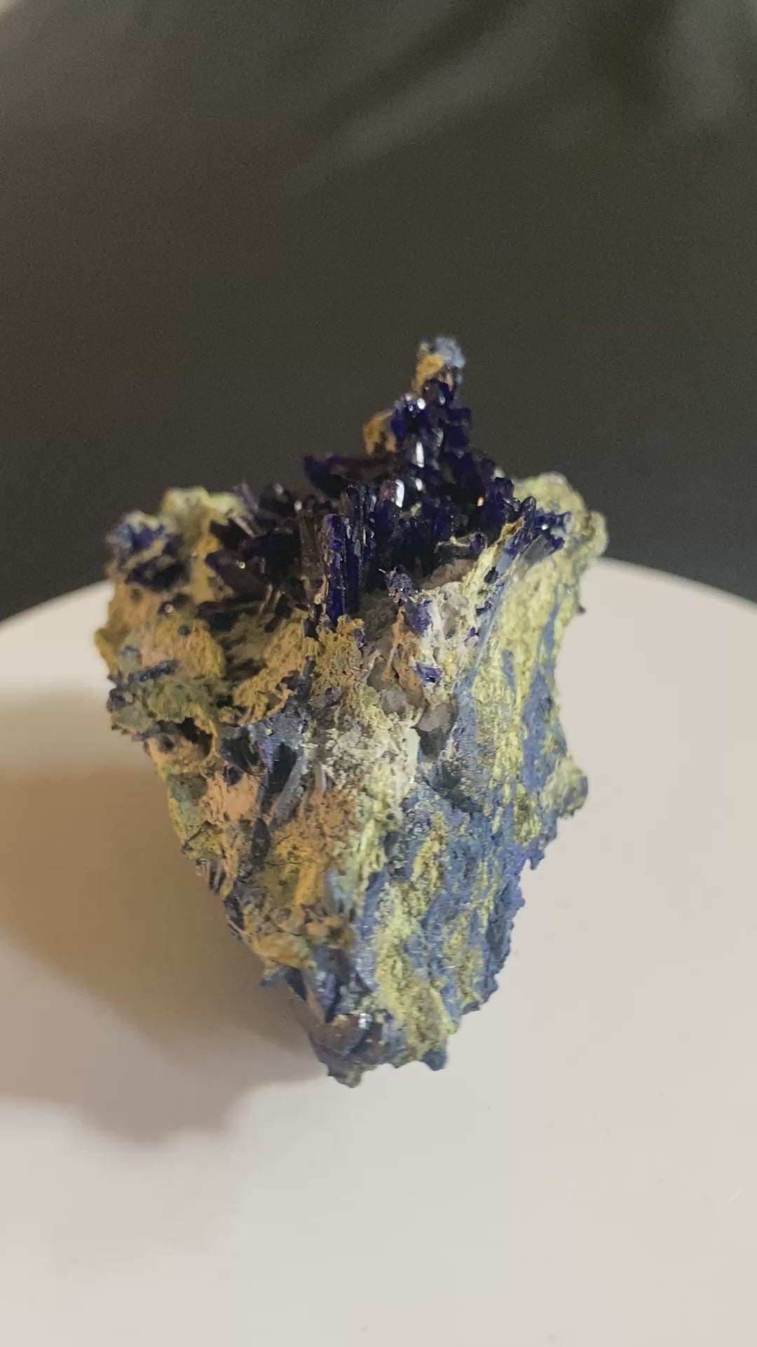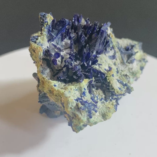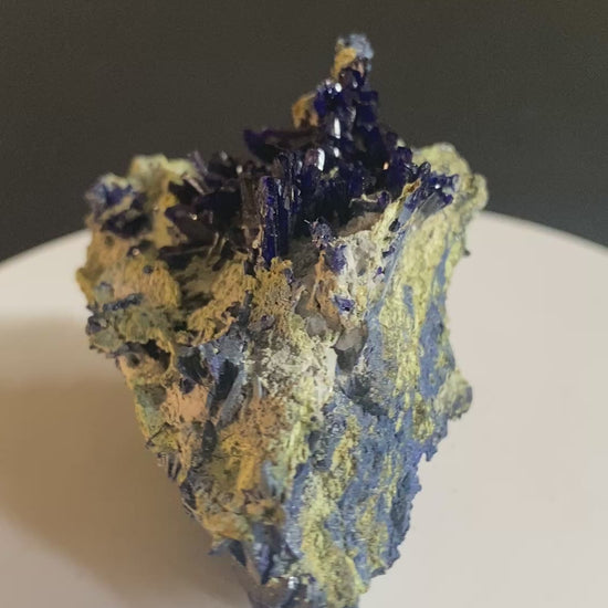 One of the prettiest Tsumeb azurites I have offered. This beautiful classic has an electric blue azurite spray contrasting superbly against lighter coloured matrix. The azurite crystals are lathe-shaped with terrific form and terminations. Digenite (copper sulphide) forms veins within the matrix, accounting for the surprisingly high weight of this small piece. Other species may also be present (typical of Tsumeb). Ex Garry Kolodinsky collection. From Tsumeb, Namibia. Dimensions: 3 cm x 4.5 cm x 5.5 cm