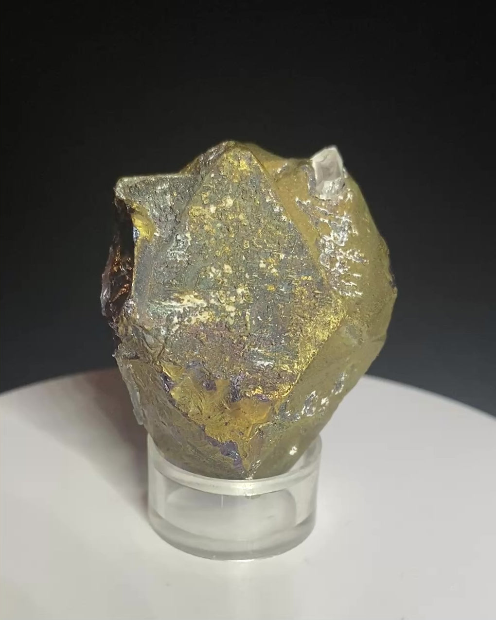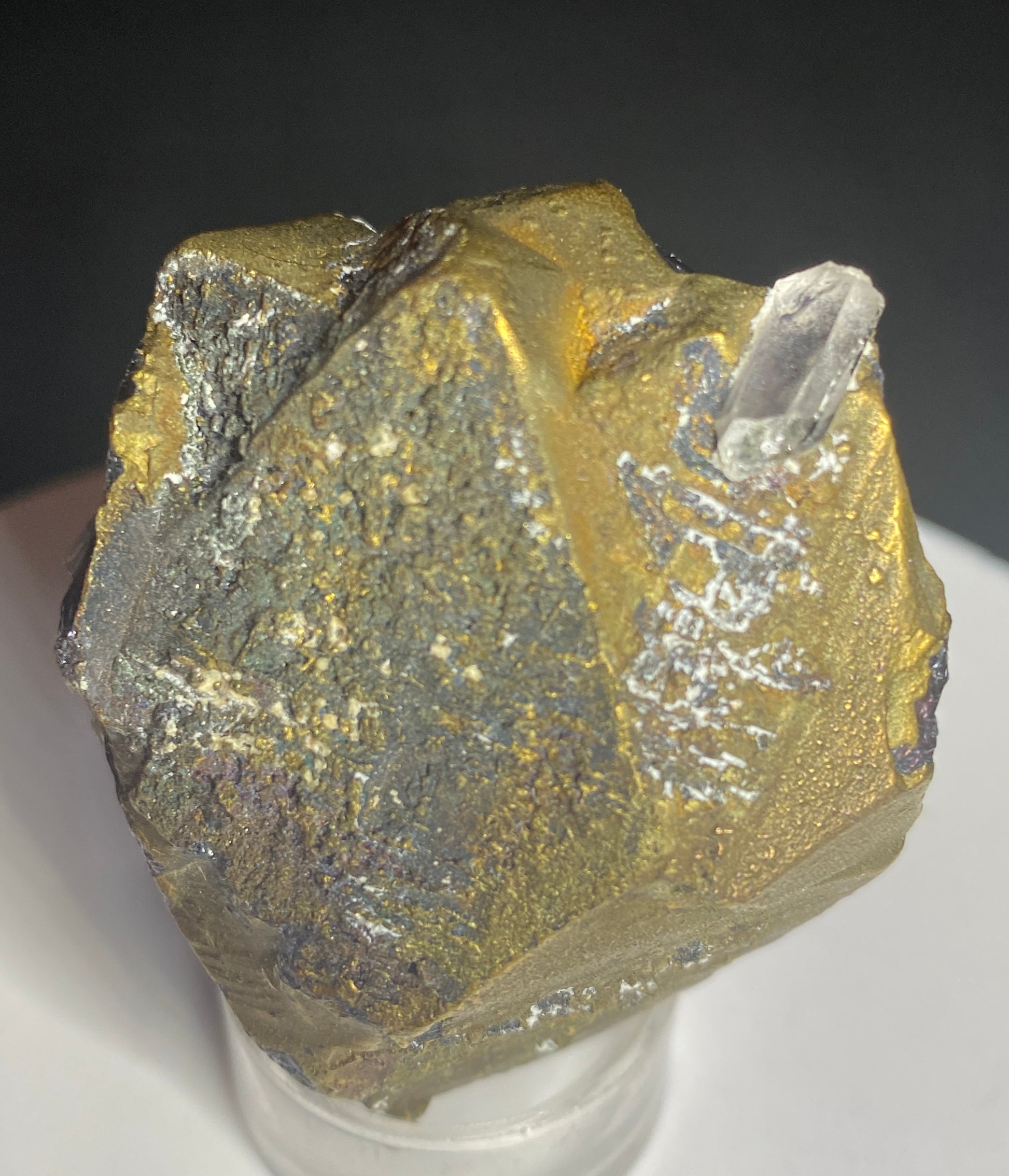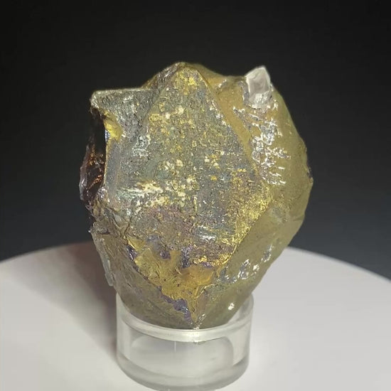We strive to offer our customers rare and unique minerals. This specimen certainly fits that profile: a bornite crystal! Yes, bornite is a relatively common copper sulphide (commonly known as "peacock ore") but have you ever seen a crystal of this mineral? At first glance this specimen is clearly crystalized but the colour suggests chalcopyrite (another copper sulphide), however two sides of the specimen (especially the basal contact) show the golden colour is only skin deep. The interior of the specimen is, in fact, bornite of a deep, metallic purple! The conchoidal fracture is a match for bornite as well. The golden surface colour may actually be chalcopyrite but we have not conducted any tests to confirm this. Not only are crystals of bornite rare, but the size of this crystal is impressive too. Note the small euhedral quartz crystal attached to one face of the bornite for added interest. This specimen was collected in the 1980s and was recently in the Allan Ingelson collection. See the November-December 1978 issue of Mineralogical Record (Volume 9, Number 6). From the Mindola open pit, Rokana Mine, Zambia. Dimensions: 2 cm x 3.5 cm x 4.5 cm