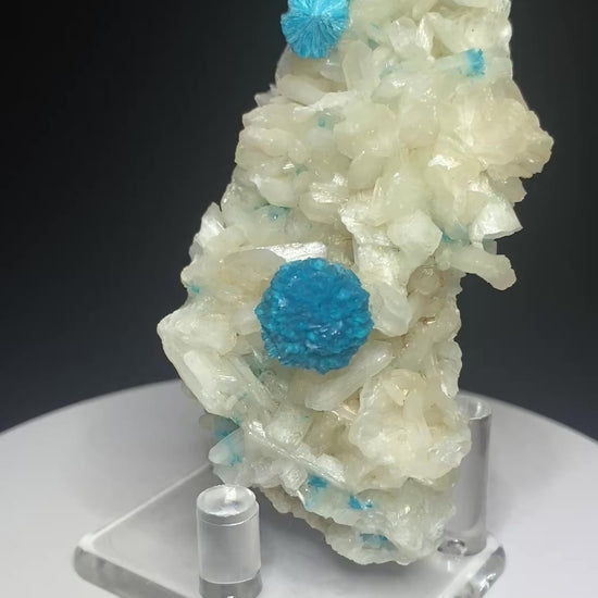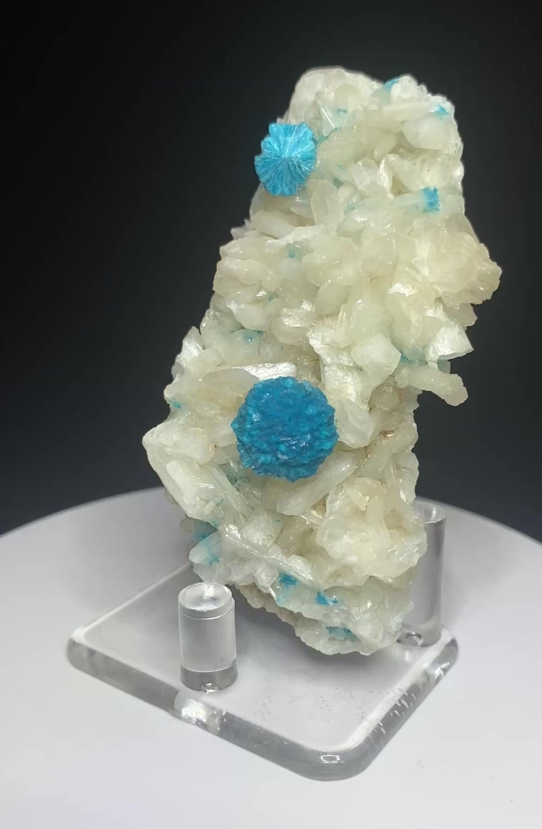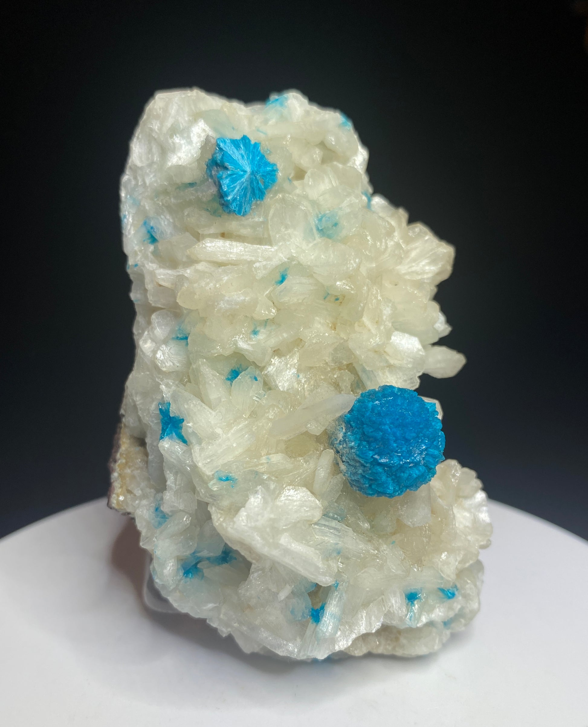 A true modern classic in the mineral world is bright blue cavansite resting on white stilbite. The surreal colour and spherical form of cavansite turns heads regardless if you know anything about minerals or not. In this example I have debated trimming off the one sphere which has been exposed, however, it shows the internal, radiating crystal structure of cavansite and is, therefore, somewhat educational. Any specimens of this material on the market are from recycled collections as nothing new has come from Wagholie in quite some time. From: Wagholi Quarries, Pune, Maharashtra, India. Dimensions: 5 cm x 7 cm