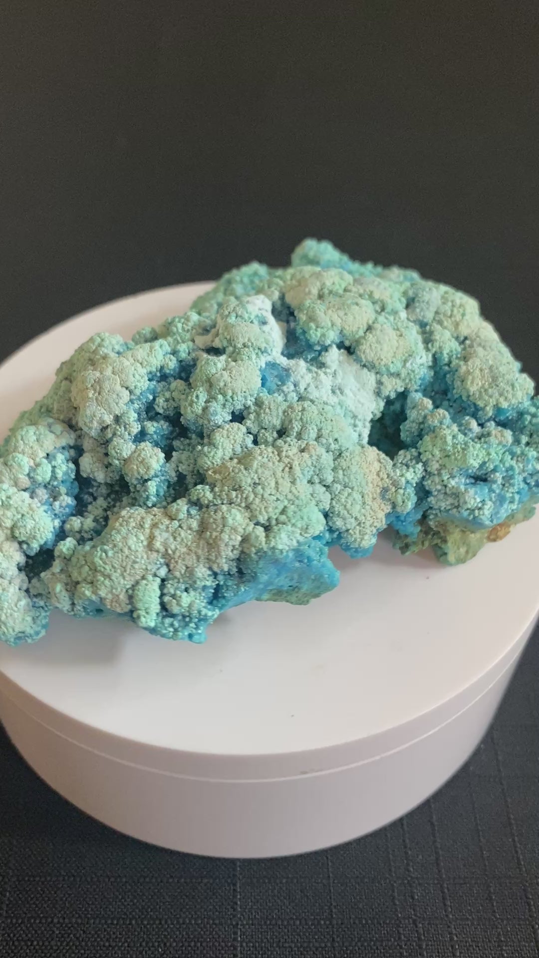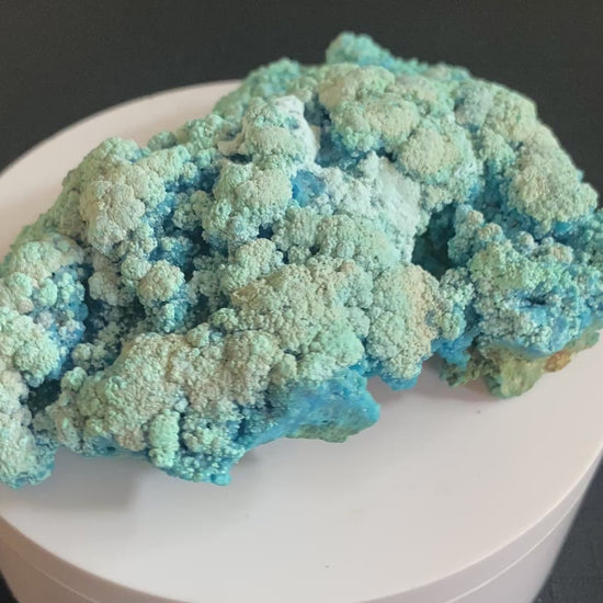 I love offering unique and special minerals and this piece is an excellent example. This chrysocolla specimen is best described as a colloform (cauliflower-like) crust and is light-weight for its size. The colour and form remind me of coral from a tropical locale! Very beautiful indeed! An old hand-written note states this piece is from the Kalukuluku Mine which helps date the age of the specimen. The mine was re-named in 1967. Ex Garry Kolodinsky collection. From L'Etoile du Congo Mine (Star of Congo Mine or Kalukuluku Mine), Lubumbashi, Haut-Katanga, Democratic Republic of Congo. Dimensions: 3 cm x 8.5 cm x 11 cm