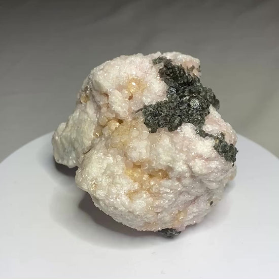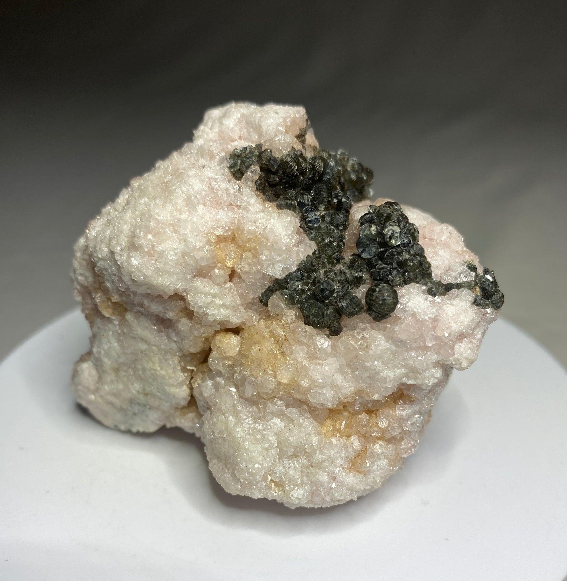 Clinoclore is a relatively common mineral in the chlorite group, but there is nothing common about the Jeffrey Mine in Quebec. Formerly a large producer of chrysotile (aka "asbestos), the mine also yielded an impressive array of collector-quality minerals. Here we have a fun combination of dark green clinoclore cyrstals resting on mostly colourless grossular garnet. This specimen has fascinating fluorescence under long wave (365nm) ultraviolet light. I have debated keeping this specimen for myself! Ex Garry Kolodinsky collection. From: Jeffrey Mine, Val des Sources (Asbestos), Quebec, Canada. Dimensions: 6 cm x 6 cm