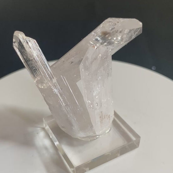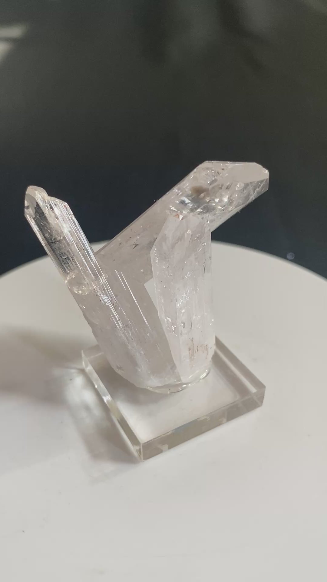 Arguably the world's best danburite crystals having been coming from the Mexican mines near Charcas for over well over a century. This is a classic specimen from Charcas showing several individual crystals jutting out at various angles. All the crystals are quite lustrous with sharp terminations but one small nick on the largest crystal. Otherwise an attractive miniature; mounted on an acrylic base. Ex Steve Potvin collection. From Charcas, San Luis Potosi, Mexico. Dimensions: 3 cm x 3.5 cm x 4.5 cm