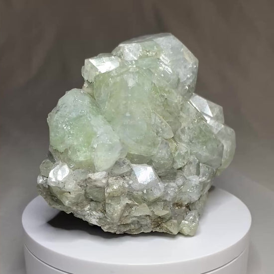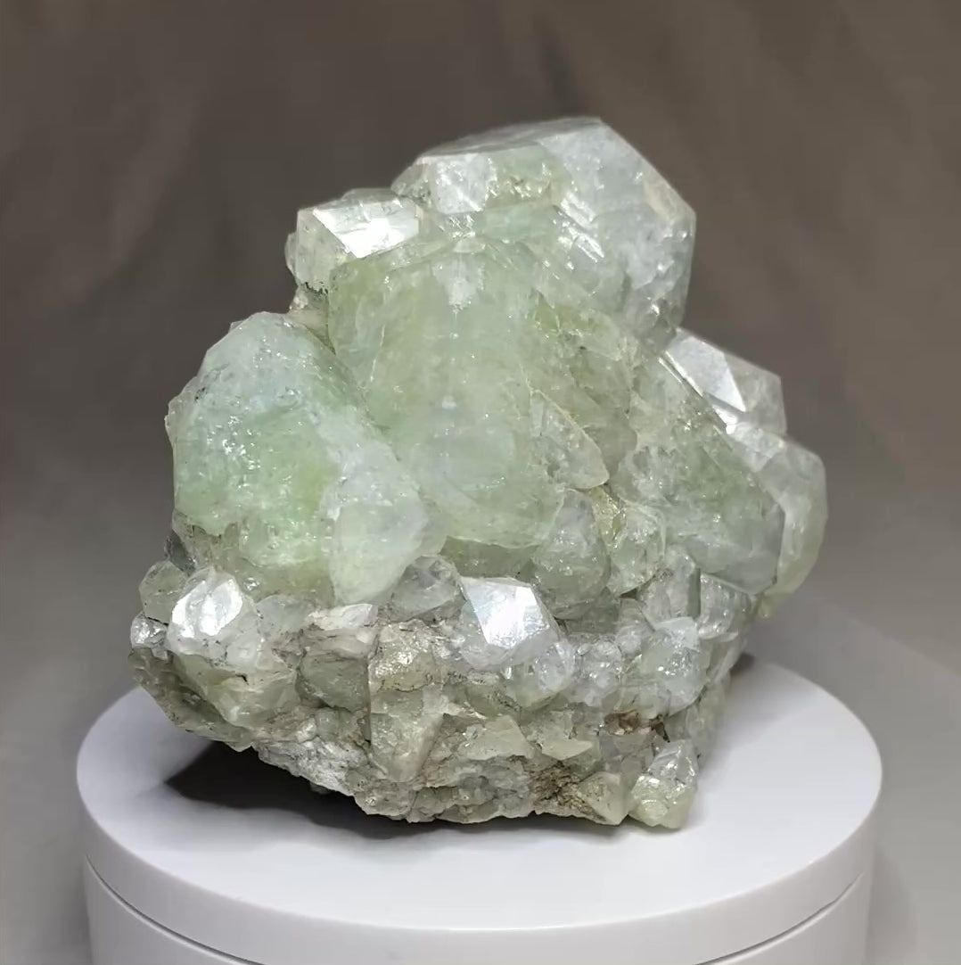The mines at Dalnegorsk have yielded many impressive minerals with some people electing to focus solely on collecting this locality. Among the attractive minerals from this famous Russian deposit is datolite, a rare calcium borosilicate. This mineral can come in many forms, like reddish-coloured nodules from Michigan to green, lustrous crystals like this one. This is a hefty specimen too, weighing in at about 1 kg. The crystals are large and complete with no damage, though show internal fracturing. For those who like to study crystals, and enjoy cabinet-sized specimens, this would make a good acquisition. Ex Garry Kolodinsky collection. From: Dalnegorsk, Primorsky Krai, Russia. Dimensions: 7.5 cm x 8.5 x 13 cm