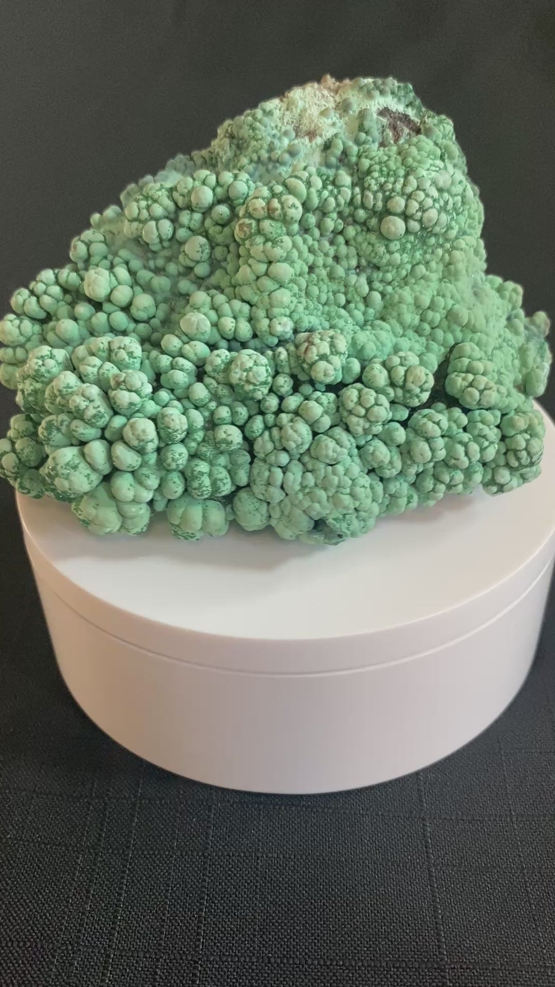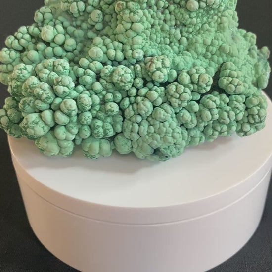 One of my favourite specimens acquired from the Garry Kolodinsky Collection is this fun combination of copper minerals from Morenci. The botryoidal form of chrysocolla first grabs your attention on this outstanding cabinet-sized piece. Closer examination, however, also reveals a sprinkling of tiny, lustrous dioptase crystals across most of the specimen! The darker green of the dioptase is nicely backdropped by the softer chrysocolla for an impressive overall appearance. Very interesting form and chemistry on this piece. Ex Garry Kolodinsky collection. From Morenci Mine, Morenci, Greenlee County, Arizona. Dimensions: 7 cm x 9 cm x 10 cm