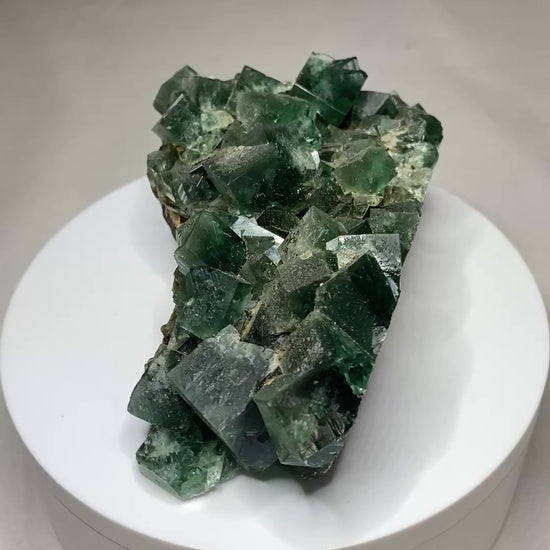 Certainly one of the most famous contemporary fluorite localities in the world is the Rogerley Mine near Frosterley, England. The mine, one of the first in the world to mine exclusively for mineral specimens, produces very attractive and unique fluorite. Emerald-green fluorite from the mine, like this one, have remarkable fluorescent properties. When exposed to long wave ultraviolet light the fluorite turns a neon blue reminiscent of night club lights. However the best surprise is when you place the specimen into daylight and watch the green suddenly turn a deep purple-blue hue - truly amazing! I once took my personal specimen to my daughter's school to show for her grade 3 science class. The teacher's wanted to know my magic trick as I pulled the specimen in and out of bright sunlight coming in the window, but I said the secret can only be learned in physics class! This piece exhibits all of these colour phenomena and displays interpenetrate twins with sharp cubic faces too. This very nice example is from the famous "50 Year Pocket" discovery named after the mine's 50th anniversary. From: Rogerley Mine, Weardale, County Durham, England. Dimensions: 6 cm x 10 cm