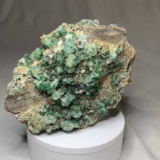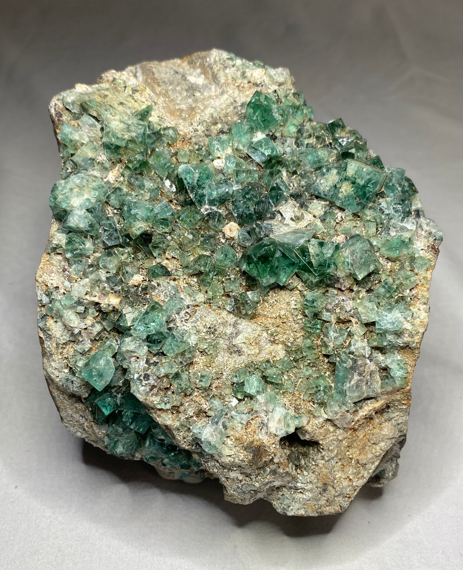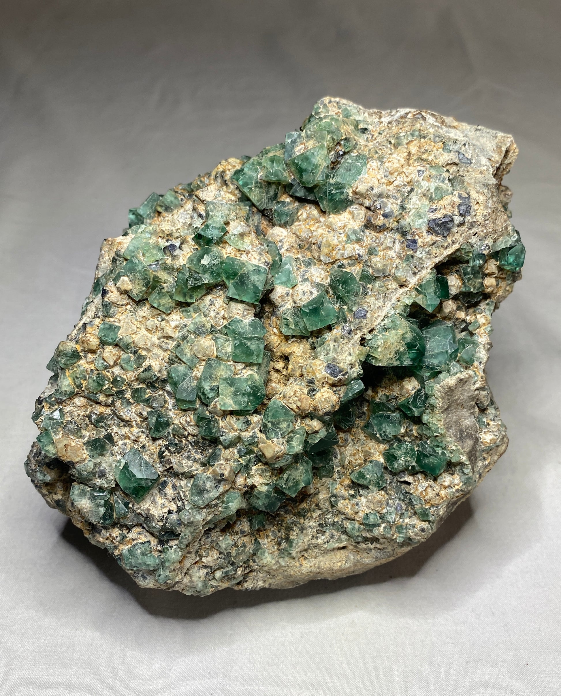 A large cabinet specimen of fluorite with three-dimensional character. Fluorite completely surrounds this piece providing excellent geological context. Every cavity and layer shows deposition of small green fluorite cubes. Being from the Rogerley Mine, the green fluorite, of course, partially fluoresces to blue in daylight (certainly one of the most impressive light phenomena in the mineral world). Also as per Rogerley, several fluorite crystals are twinned. Due to its size and irregular nature, one could trim this specimen into several smaller ones to maximize display quality but I am a purist and enjoy its current context. Ex Garry Kolodinsky collection. From: Rogerley Mine, Weardale, County Durham, England. Dimensions: 7.5 cm x 11 cm x 13 cm