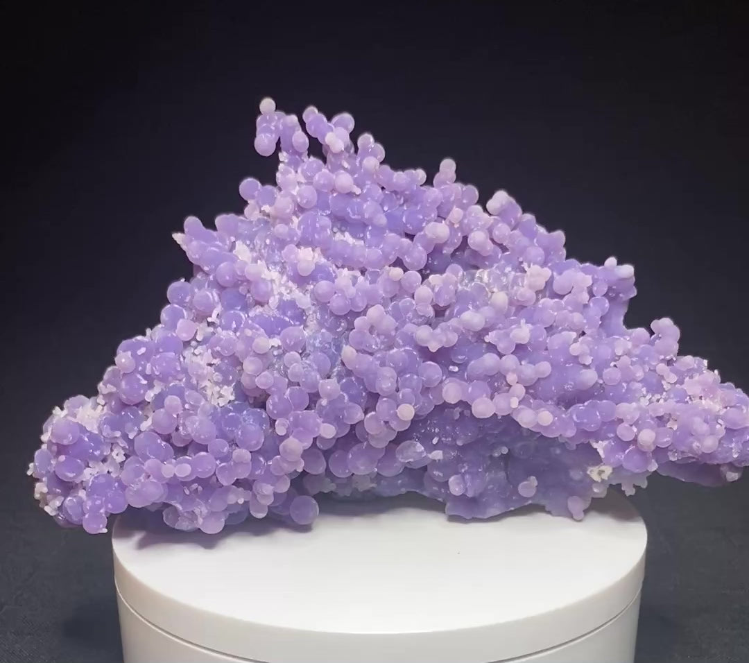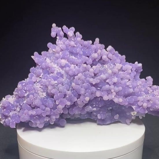 "Grape" amethyst hit the mineral scene a few years ago and made quite the splash with its bold colours and candy-like form. Sometimes mislabeled as grape "agate", these are actually tiny spheres of crystalline quartz (with the purplish variety called amethyst), whereas agate would be composed of cryptocrystalline quartz. There is high demand for this material but quality pieces have become very scarce the past few years. Mining of new specimens has slowed to a trickle as the easy-to-find "grapes" have already been extracted. I have secured several nice pieces with pleasing purple-pink hues and great luster that were being held back by a supplier. I expect this to be the last year I can offer specimens of this quality so don't wait if you have been looking for a good example. From Mamuju area, Sulawesi Barat Province, Sulawesi, Indonesia. Dimensions: 9 x 15 cm