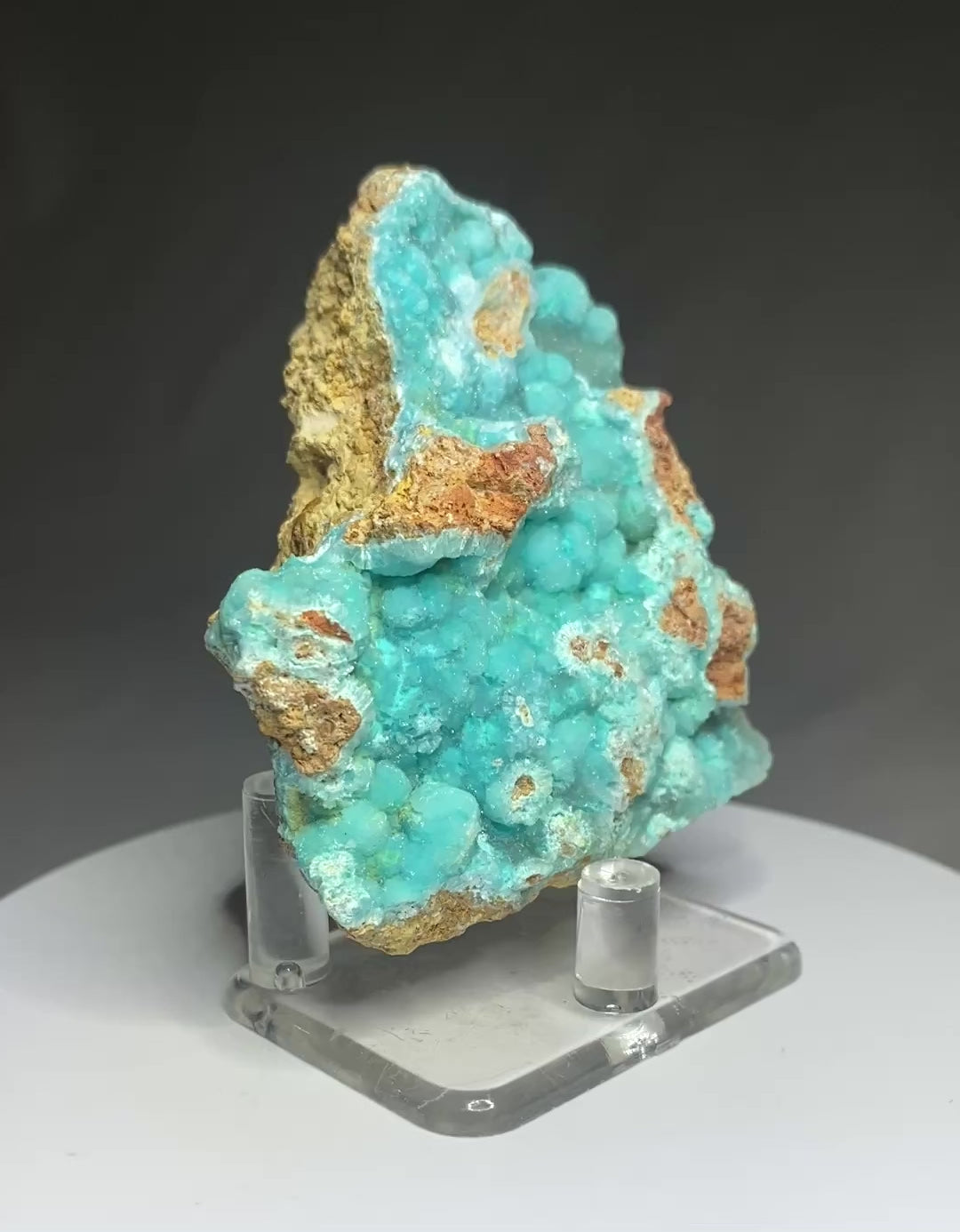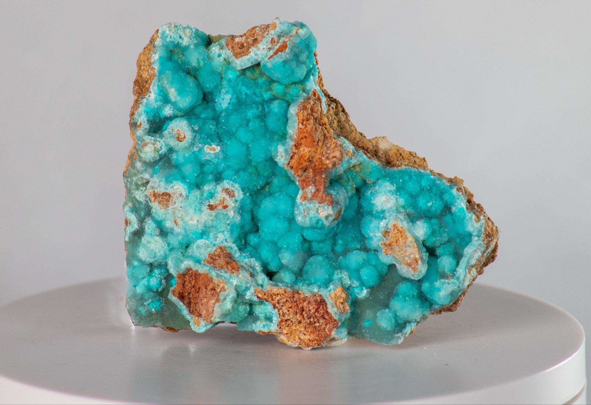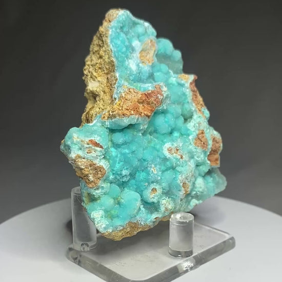 Brightly coloured hemimorphite from the famous mines at Wenshan. The hemimorphite is micro-crystallized into botryoidal aggregates with nice sparkle. I particularly like the contrast with the limonitic matrix. Ex Allan Ingelson collection. From: Wenshan, Yunnan Province, China. Dimensions: 6 cm x 7 cm