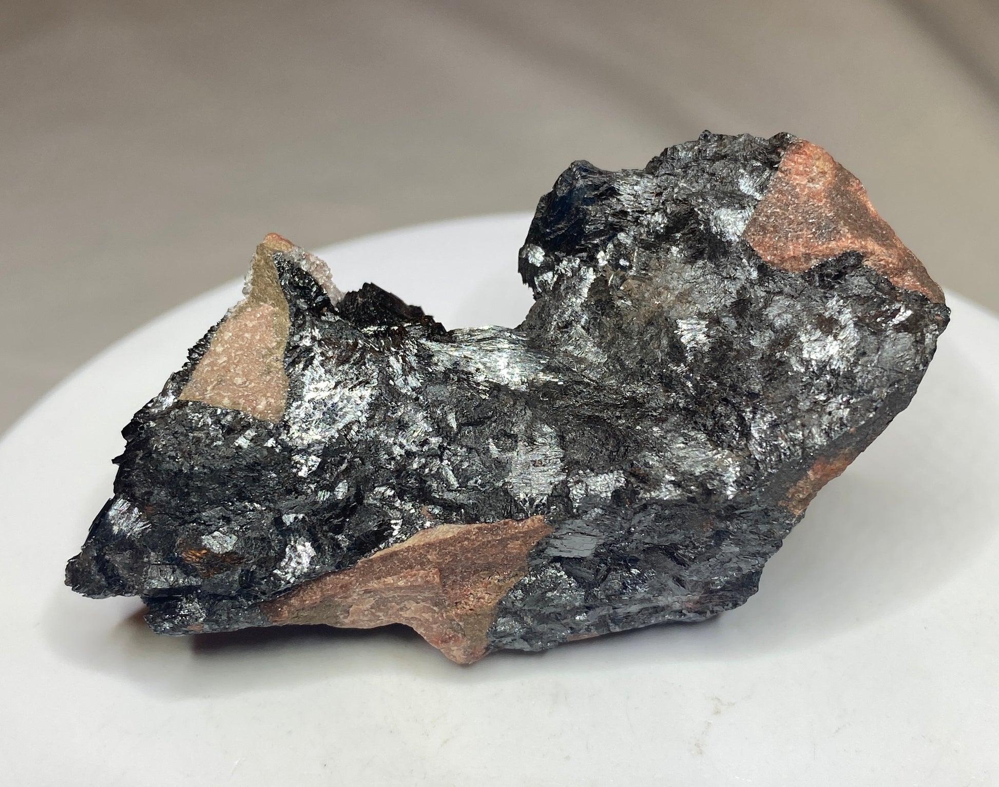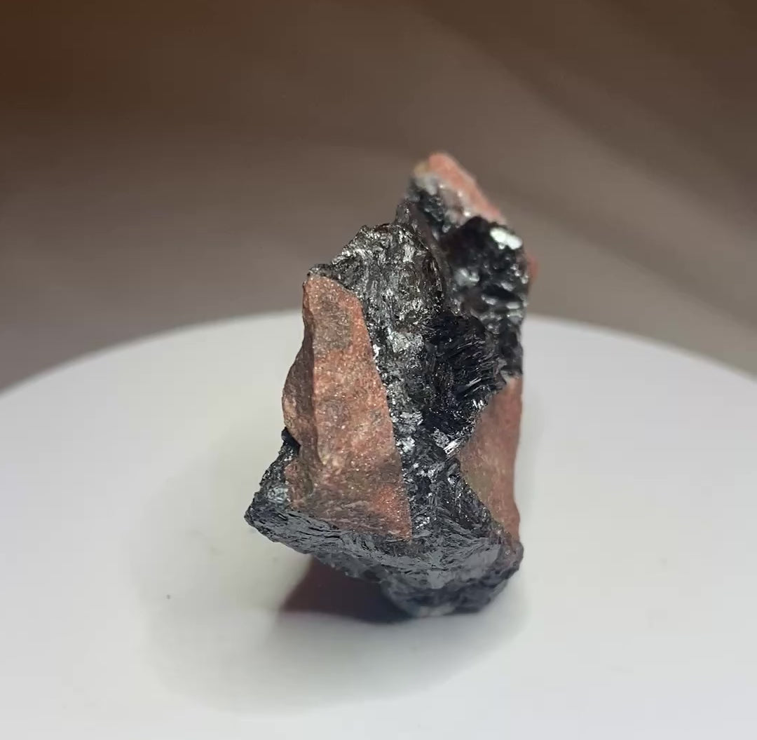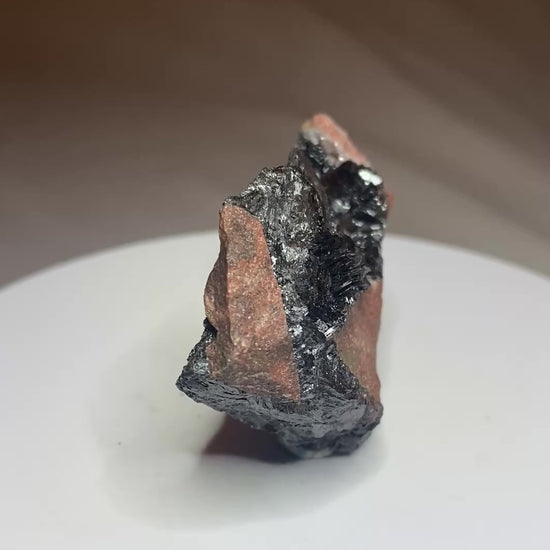 Although mining ceased in 1979-80, the manganese mines near Atikokan were a key strategic deposit for the Allies in WWII. Ore from Atikokan was added to the larger iron ore deposits located in the northern USA for steel production for the war effort. The mines also are well-known for their excellent manganite crystals. Perhaps not as robust and sexy as those from Germany, they are now Canadian classics. Rocky Mountain Minerals & Fossils recently acquired a selection of these from a former mine engineer that had stashed them in his garage since the mine's closure. These pieces have never before been offered for sale. This sample shows evidence of veining and open cavities with displays of larger manganite crystals than our other offerings. The colour contrast with the pinkish matrix is striking. From: Caland Pit, Schwenger Township, Atikokan, Ontario. Dimensions: 4.5 cm x 7 cm