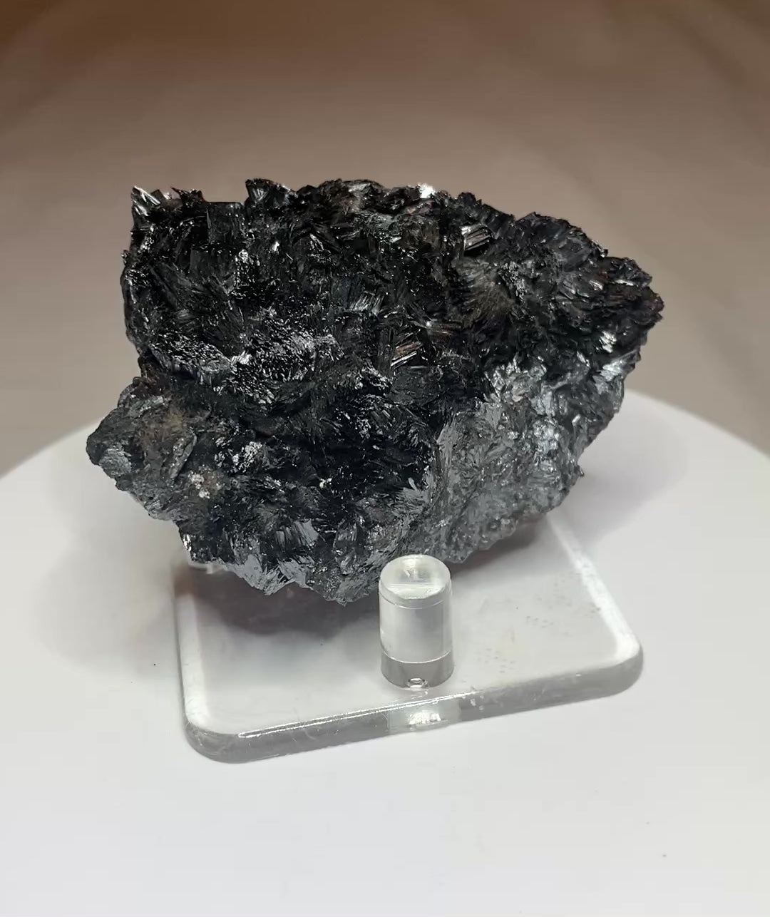 Although mining ceased in 1979-80, the manganese mines near Atikokan were a key strategic deposit for the Allies in WWII. Ore from Atikokan was added to the larger iron ore deposits located in the northern USA for steel production for the war effort. The mines also are well-known for their excellent manganite crystals. Perhaps not as robust and sexy as those from Germany, they are now Canadian classics. Rocky Mountain Minerals & Fossils recently acquired a selection of these from a former mine engineer that had stashed them in his garage since the mine's closure. These pieces have never before been offered for sale. One of the finest pieces from this old lot, showing full coverage of spikey manganite crystals on massive manganite. From: Caland Pit, Schwenger Township, Atikokan, Ontario. Dimensions: 5 cm x 6 cm
