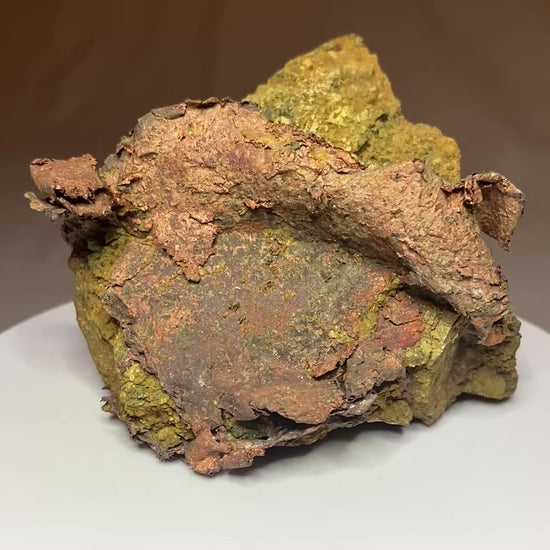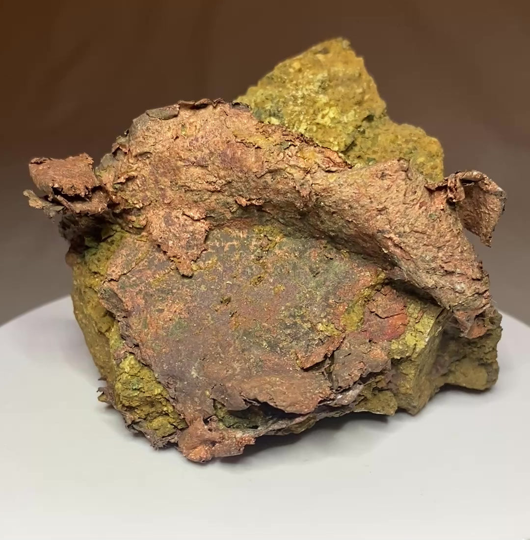 Beginning in 1977, the Afton Mine exploits a porphyry copper-gold deposit via open pit operations. The mine has experienced two lives, having once been closed and back-filled. The mine was reopened in 2007 after new reserves were discovered. This terrific native copper specimen was derived from the earlier phase of mining. Native copper drapes across the front of the specimen, matching the matrix's folds and creases. Fascinating! Ex Mike Clark and Mike Evick collections. From: Afton Mine, Kamloops, British Columbia, Canada. Dimensions: 6 cm x 8 cm 8 cm
