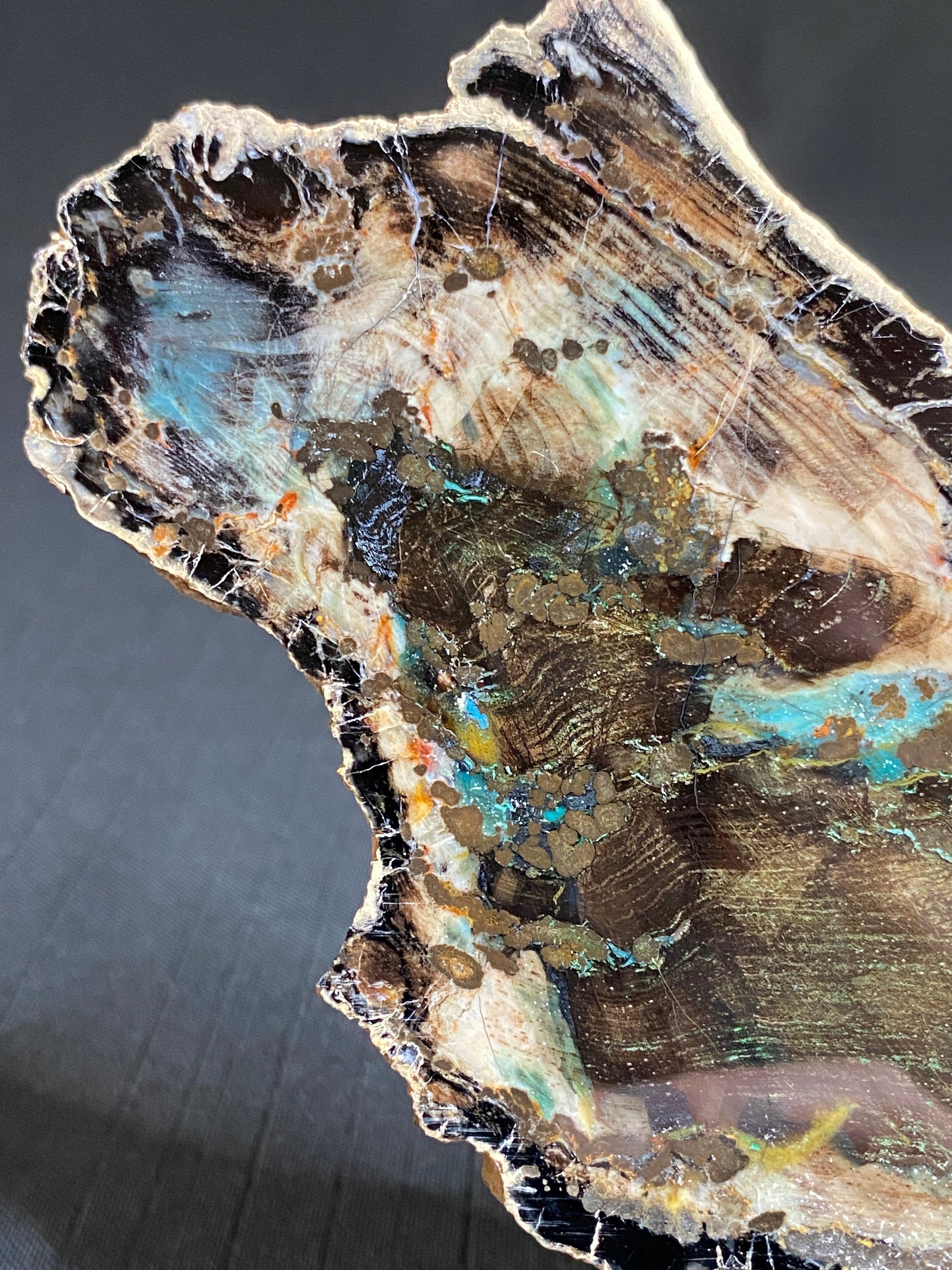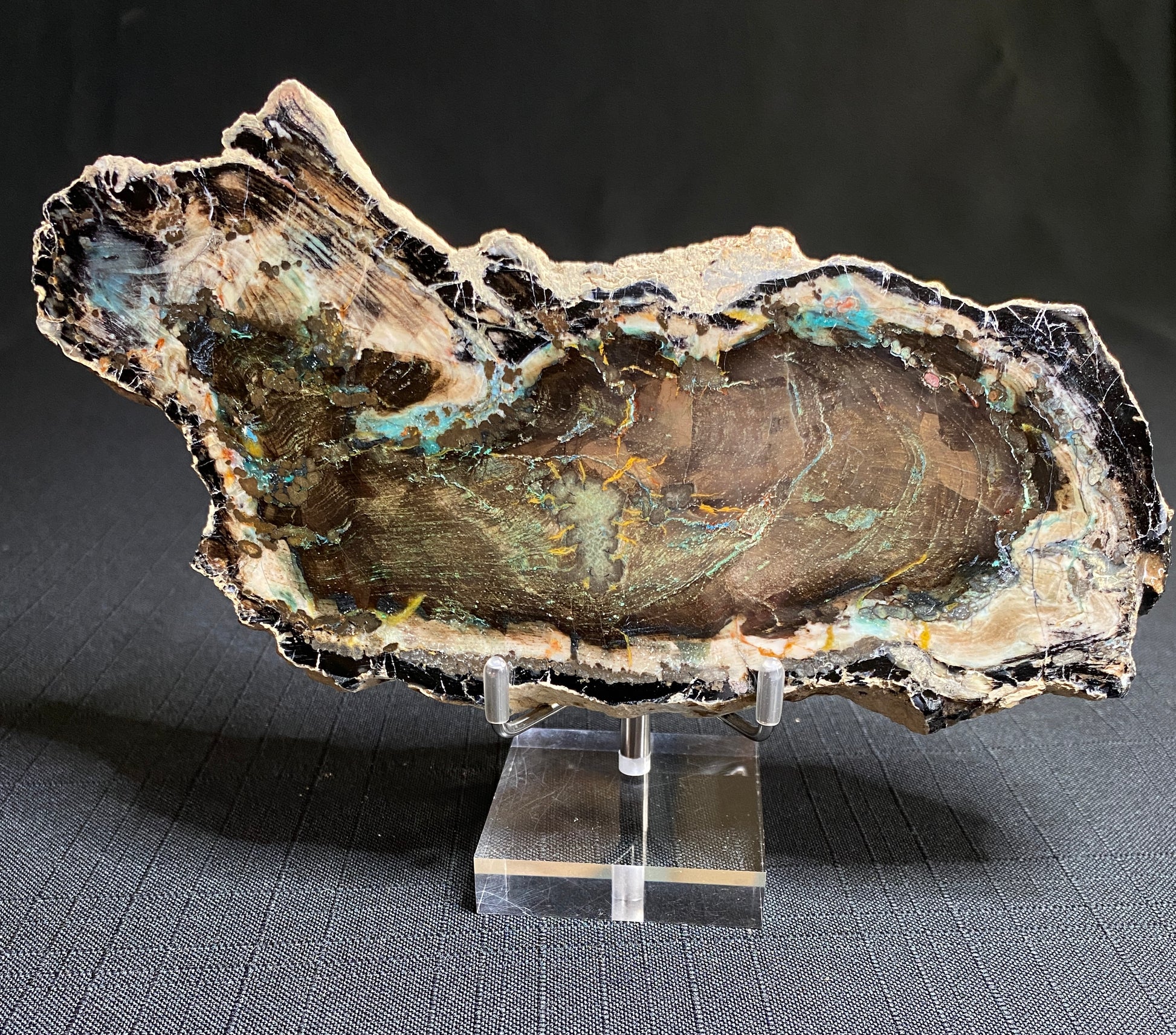 This agatized wood is found over a copper deposit in Turkey with only a few pieces showing unique replacement with various copper minerals. The wood is a white pine but the term "Colla Wood" has been coined to popularly name the material stemming from the chrysocolla present in many specimens. This specimen shows a complete "round" with good preservation of bark. I especially like the contorted growth rings which help tell a story of this tree's life. True to its name, chrysocolla has replaced some of the agatized wood. A close inspection reveals an abundance brown cuprite crystals too. If you look very closely you can even recognize crystal faces! I believe the small streaks of orange are siderite. Note that the chalcedony fluoresces for added interest. Possibly of Miocene age. Zile, Tolkat Province, Turkey. Dimensions: 8 cm x 19 cm