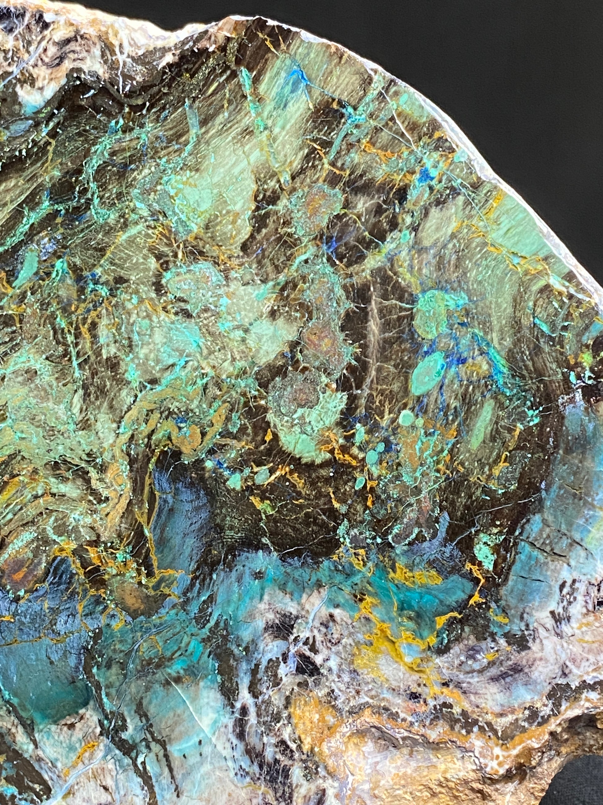 This is the largest slice of Turkish "Colla Wood" I have offered and one of the most colourful. The agatized white pine from near Zile, Turkey overlies a copper deposit with some of the wood having absorbed various copper minerals. The term "Colla Wood" stems from the chrysocolla (blue green) present in many specimens, including this one. Other minerals present in this piece are malachite (light green), azurite (dark blue), cuprite (discreet red-brown crystals) and siderite (thin orange streaks), all within white and black chalcedony (agate)...which fluoresces! Fossil specimens like these are impressive mineralogically but are equally aesthetic too and would fit into any quality collection. Possibly of Miocene age. Zile, Tolkat Province, Turkey. Dimensions: 16 cm x 29 cm