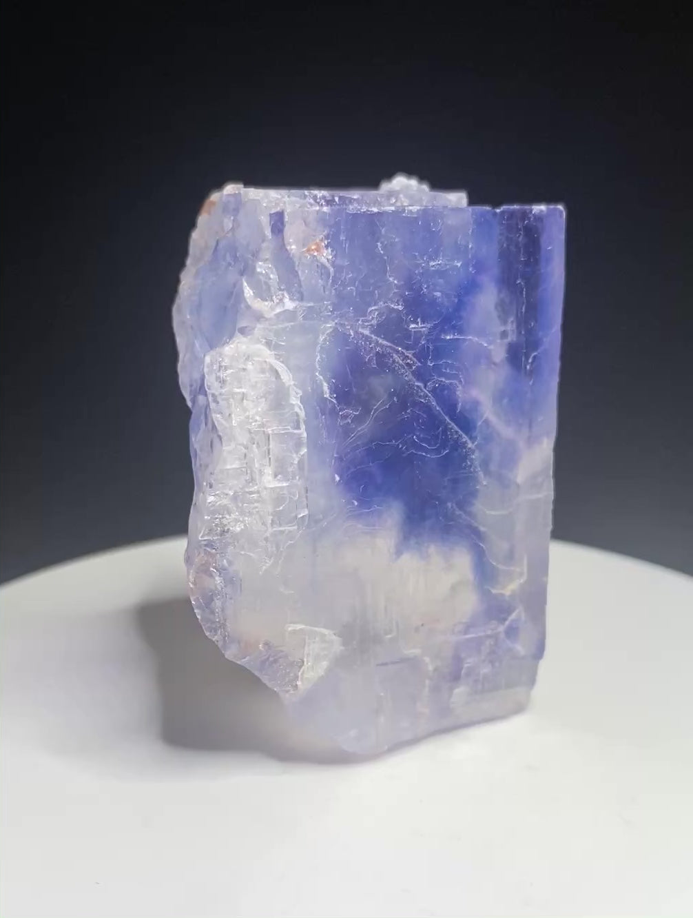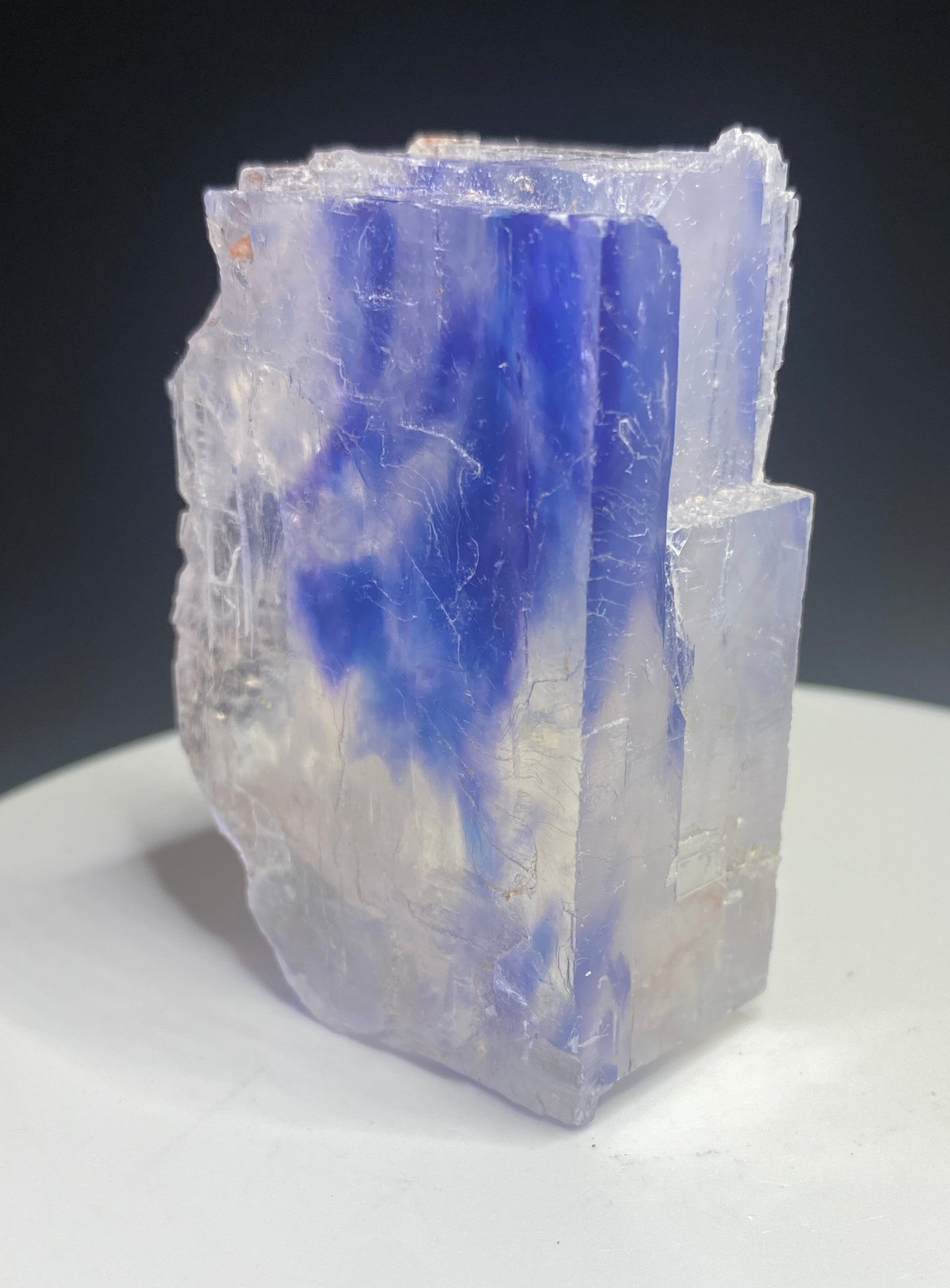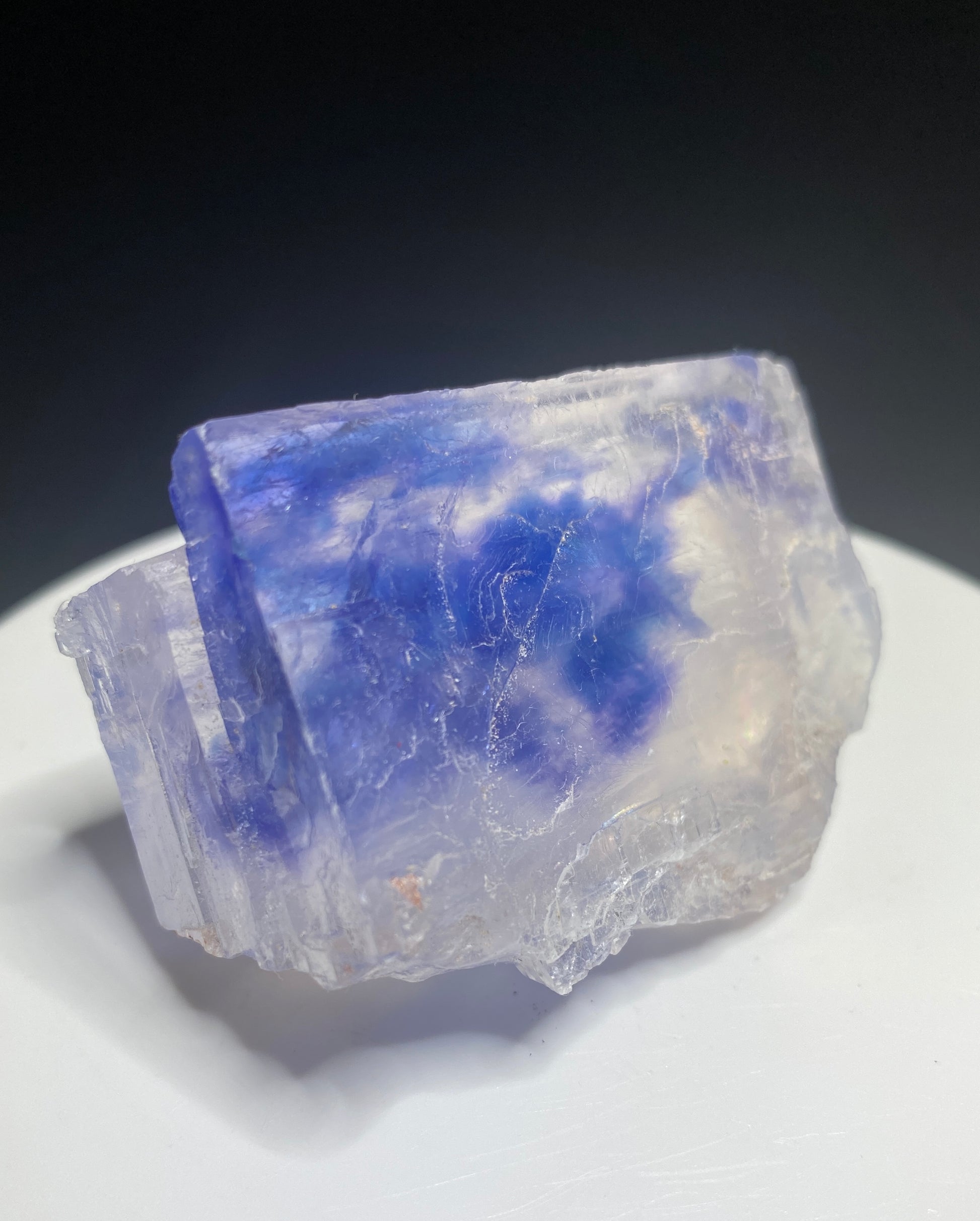 Saskatchewan is a world leader in halite and sylvite ("potash") production for the fertilizer industry, supplying 22 million tonnes annually or about 30-40% of global production. These underground mines, as you can imagine, are massive, volume-focused operations. Occasionally blue and purple halite is encountered but rarely saved from the crushers. I am not aware of any producers that allow for the collection (and preservation) of these special mineralogical wonders. Luckily the occasional miner saves a handful of pieces, like this beauty offered here. Since the specimens are collected against corporate policies, the mine for this specimen is omitted here to protect the identity of the field collector (who we hope continues to bring more to the market!). I can say these specimens were recently recovered and are from the Devonian-aged Prairie Evaporite Formation. The unique colours are possibly due to deformation of the halite crystal structure or due to minute traces of radioactive inclusions. I am not aware of any scientific work dedicated to the cause of colour in Saskatchewan halite though. This sample has plume-like blue to blue-purple colouration within a cleaved halite crystal section. A distinctive and attractive Canadian specimen. From: Prairie Evaporite Formation, Saskatchewan. Dimensions: 4 cm x 5.5 cm
