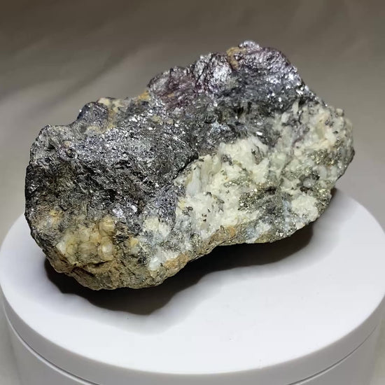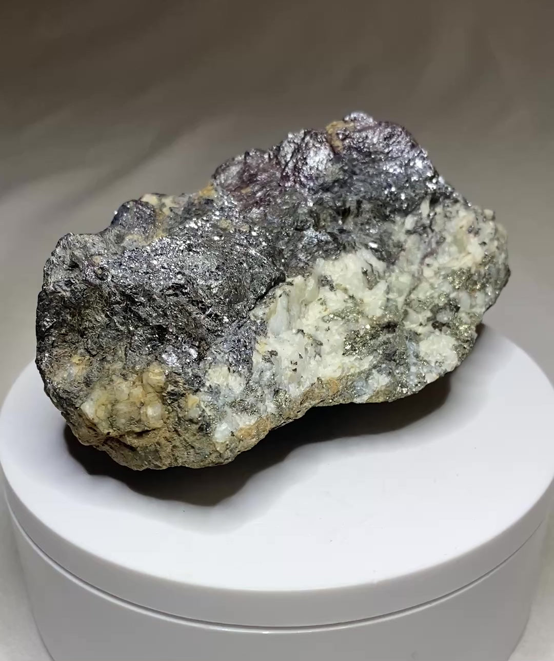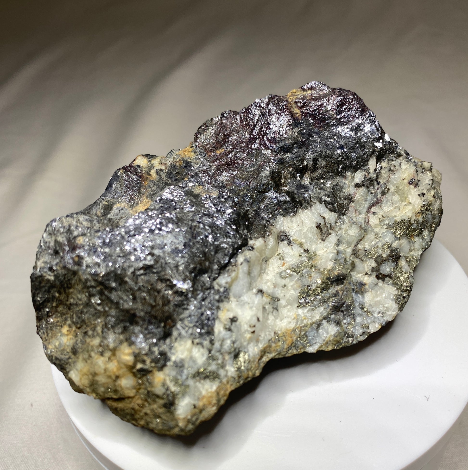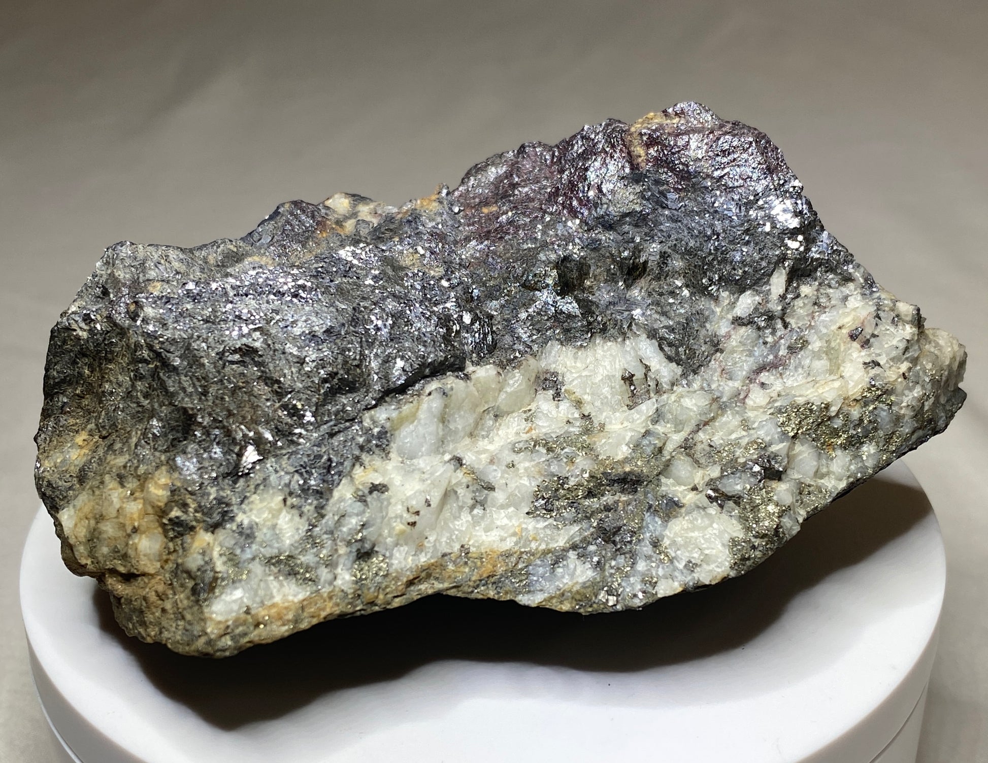 Ruby silver! The Beaverdell area, and in particular, the Highland Bell Mine, were rich in silver and silver-bearing minerals. Ruby silver, more properly, pyraryrite, was a key source of silver from the district. This terrific ore specimen displays zonation of massive pyrargyrite (slight reddish colour), galena and sphalerite within calcite speckled with pyrite. A large representative specimen (the largest of several in inventory) from a classic Canadian mining locality. Ex Garry Kolodinsky. From: Beaverdell, Greenwood Mining District, BC, Canada. Dimensions: 5 cm x 8 cm x 10 cm