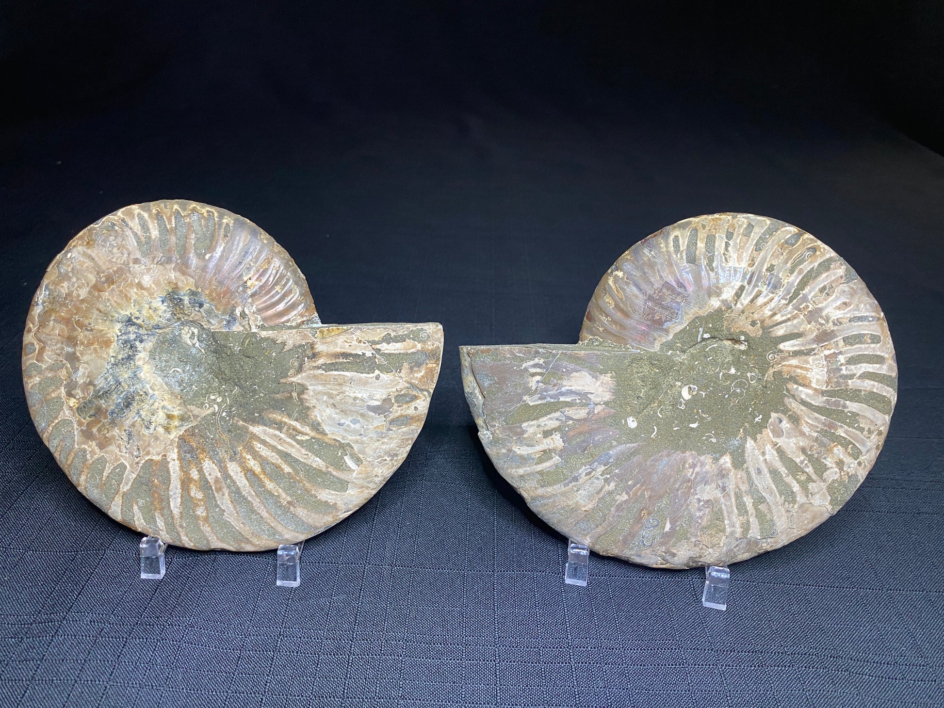 A very high-quality Cleoniceras ammonite from the Early Cretaceous of Madagascar. Each half of the sliced pair is 14.5 cm in diameter. From Ambatolafia, Mahajunga Province, Madagascar. Dimensions: 12 cm x 14.5 cm