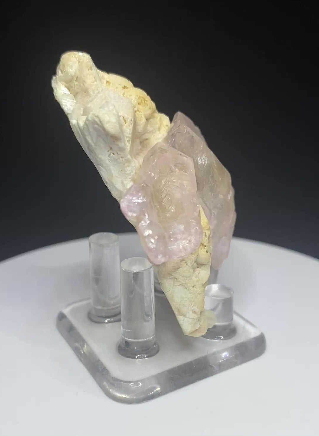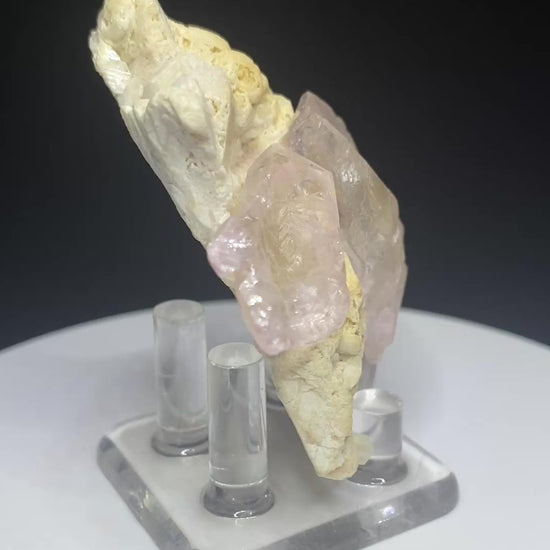Perhaps the most sought after unicorn in the quartz world is crystallized rose quartz. For some reason, rose quartz struggles to grow crystals, unlike its purple (amethyst), yellow (citrine) and colourless (rock crystal) brethren. Yet when it does grow crystals, they are often in bizarre masses and strange habits. The mineral-rich state of Minas Gerais in Brazil has reluctantly yielded the world's best rose quartz crystals like this example. Ours is a mineralogical wonder, showing two prominent rose quartz crystals, both complete. One of the crystals exhibits a "hollow" habit and is best viewed straight down the c-axis. The larger second crystal shows evidence of trying to grow another hollow crystal but is not quite complete. The crystals are attached to blocky feldspar showing some evidence of natural etching. Very cool! Ex Mike Menzies collection. From: Lavre da Ilha, Minas Gerais, Brazil. Dimensions: 4.5 cm x 6 cm