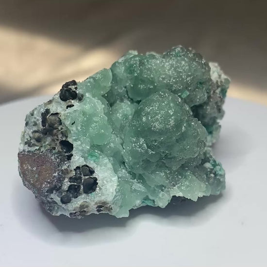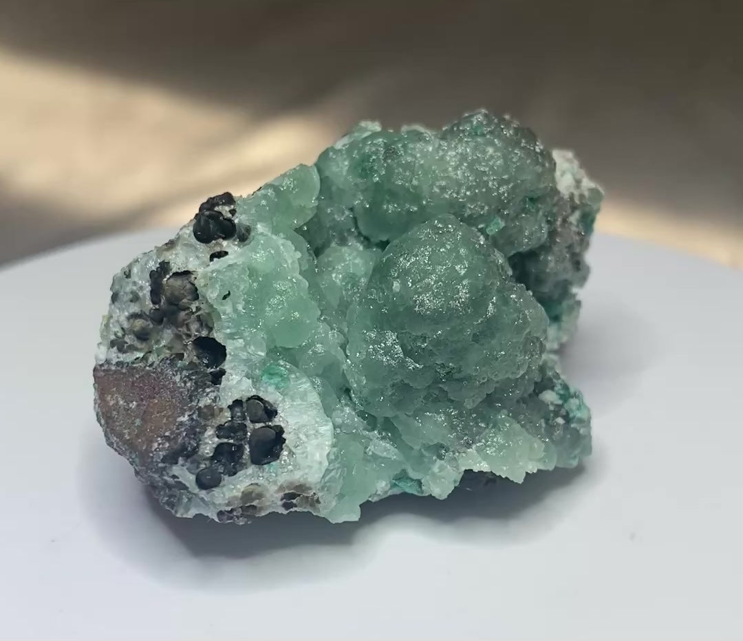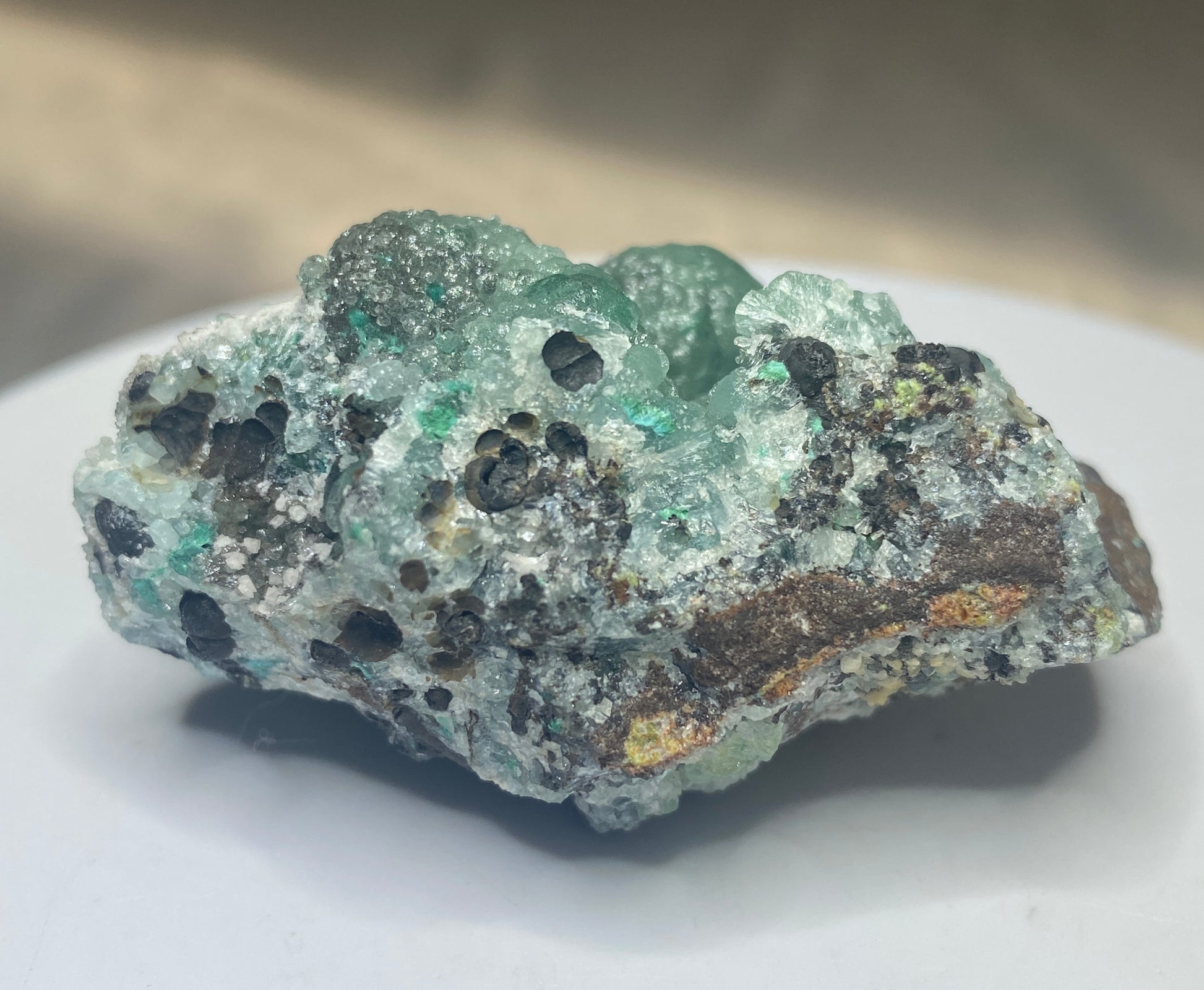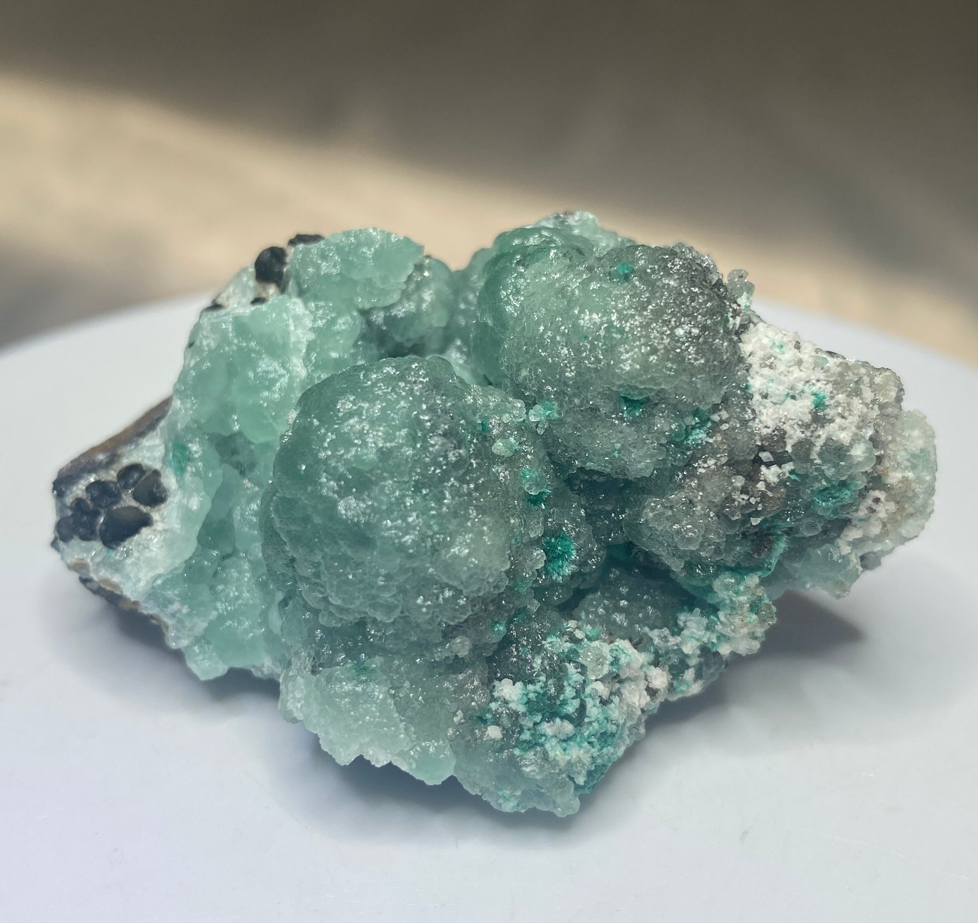 Classic Tsumeb specimen: Willemite! This piece has an appealing teal colour in botryoidal form with a waxy luster. Typical strong reaction to ultraviolet light for additional fun! This is an old Tsumeb piece and has been in a Vancouver collection since the 1970s. Ex Prosper Williams, Ex Sarah Topham. From Tsumeb, Namibia. Dimensions: 4 cm x 5.5 cm